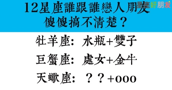羊兒和雙子以及水瓶座很容易成為戀人未滿,主要是因為牡羊和雙子座都是反應很快的星座,兩個人交談鬥嘴常常只有兩個人聽得懂。但是羊兒最信任的朋友莫過於瓶子囉!天真的他們會把所有的事都跟瓶子說,聽取瓶子的意見,而且常常是深信不移的!